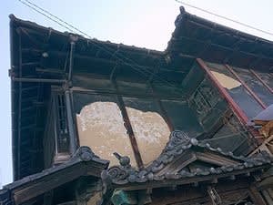↓ 以前にも観察した吉津町の黒漆喰の雅な建築(建築詳細不明)◇。傷みは激しいがまだ残っていた。しっかりと見ていなかったが、べんがら塗りだと思っていた柱は鉄骨の補強かも…(恥)。欄干や丸窓の様子からいくとそれらしき(妓楼)建物に見えたのだが…。