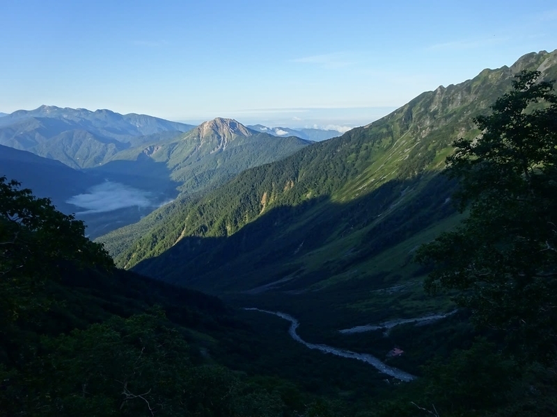 遠くの乗鞍岳と右手の焼岳に朝日が当たり始めました
