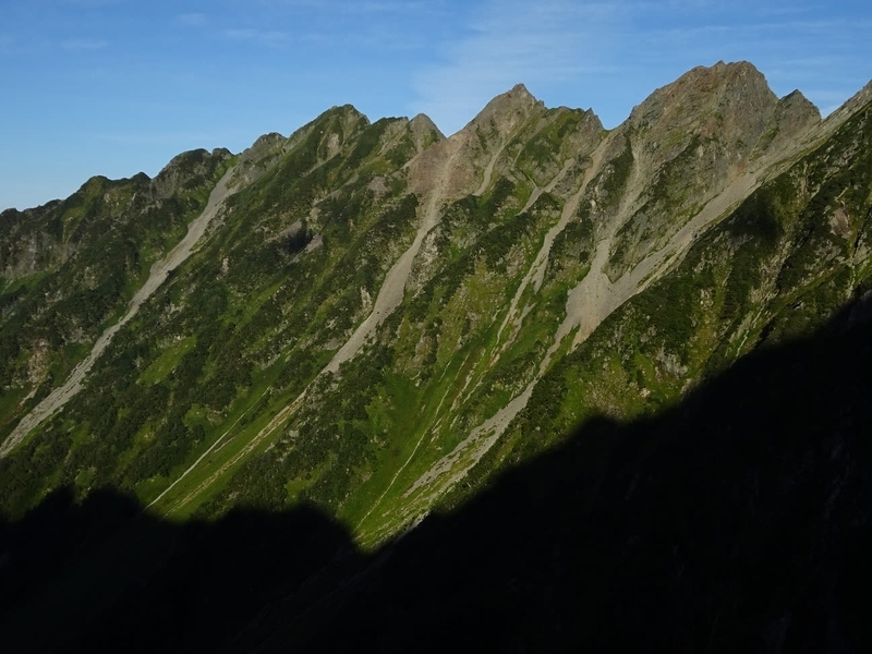 西穂高岳から奥穂への稜線にも陽が当たり始めました