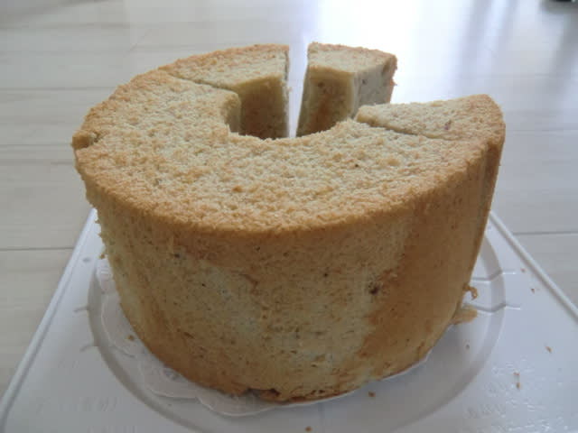 翌朝、多少二日酔いで起きて、お土産に女将さんが焼いてくれたシフォンケーキをいただきました。