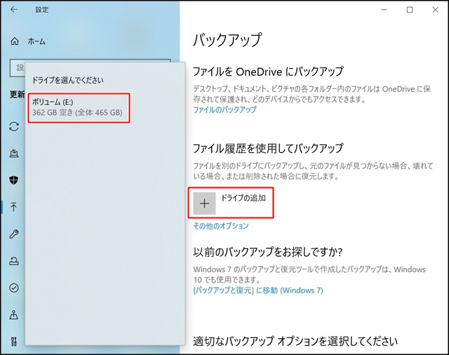 「ドライブの追加」をクリックし、USB接続した外付けハードディスクを選ぶ。