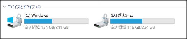 このPCの場合はボリューム(C)が241GB-134GB=107GBで、ボリューム(D)が234GB-116GB=118GB