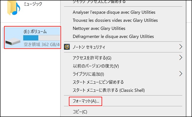 外付けハードディスクが用意できたらUSBポートに接続してからスタートメニュー→「Windowsシステムツール」→「PC」と進み、外付けハードディスクを右クリック →「フォーマット」を選択。