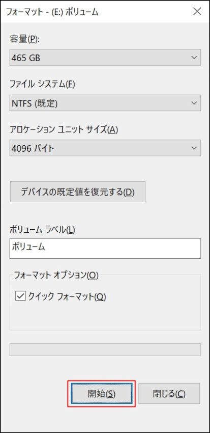 クイックフォーマットのままで「開始」を押すと数秒でフォーマットが終わり準備完了!