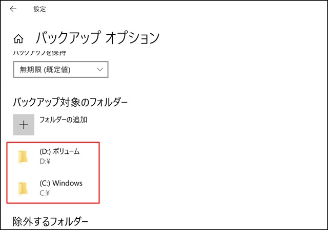 保存不要のフォルダを除外し終わったら、今度は「フォルダーの追加」をクリックして保存したいフォルダを選択する。