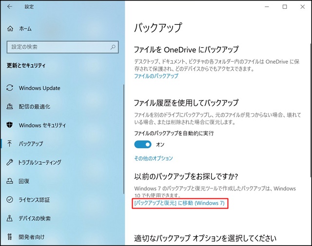 Windows10でWindows7のバックアップツールを使うには「バックアップと復元に移動(Windows7)」をクリック。