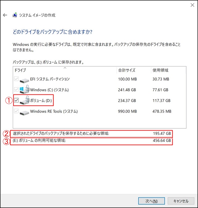 今回は丸ごとバックアップするので(D)ボリュームにもチェックを入れる。