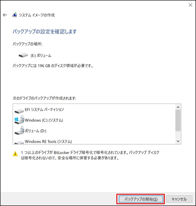 最終確認して大丈夫なら「バックアップの開始」をクリック。