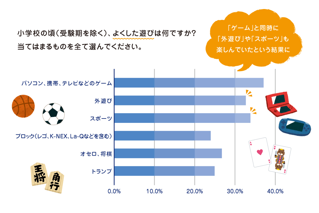 2022年に現役東大生に対して実施された別のアンケート(ひまわり教育研究センター調査)では、「小学生の頃によくした遊びは?」という質問に対して、もっとも多かった回答が「パソコン、携帯、テレビなどのゲーム」(約37%、82人)。次いで「スポーツ」(約34%、75人)、「外遊び」(約32%、72人)、「オセロ、将棋」(約26%、59人)、「トランプ」(約25%、55人)という結果に。東大生にとっても、ゲームは小学生時代から身近な遊びであることがよくわかります。