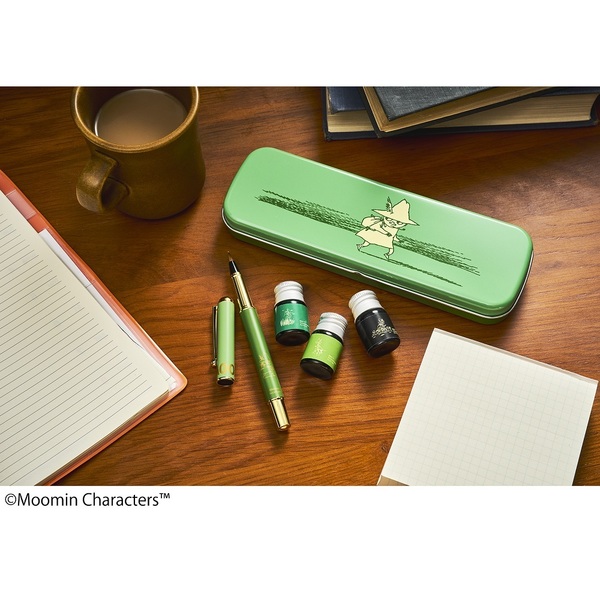 高級感溢れる、立体的なスナフキンの缶ケースのなかに6つのスタンプが入った、豪華なセットです。ギフトシーズンにもピッタリの仕様です手が汚れない、インク充填済みのスタンプだから朱肉は不要。カラーリングもスナフキンを感じる、グリーンで統一しています