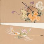 銀の揉み紙で、灰色のぼかし模様がある和紙に絹糸で菊の刺繍が施されています。