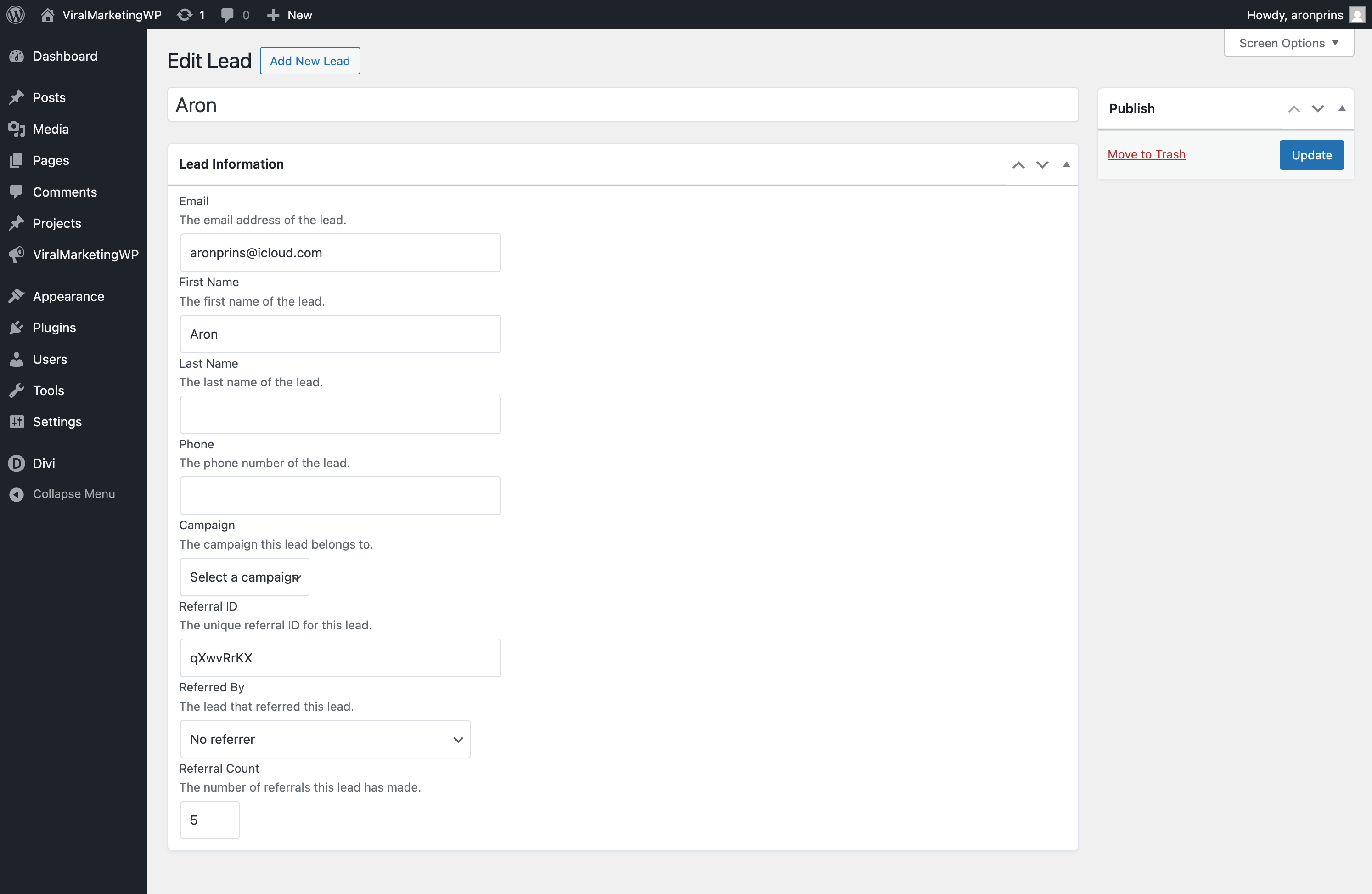 - Go to “ViralMarketingWP > Leads” to view all leads