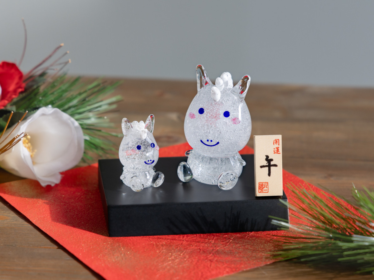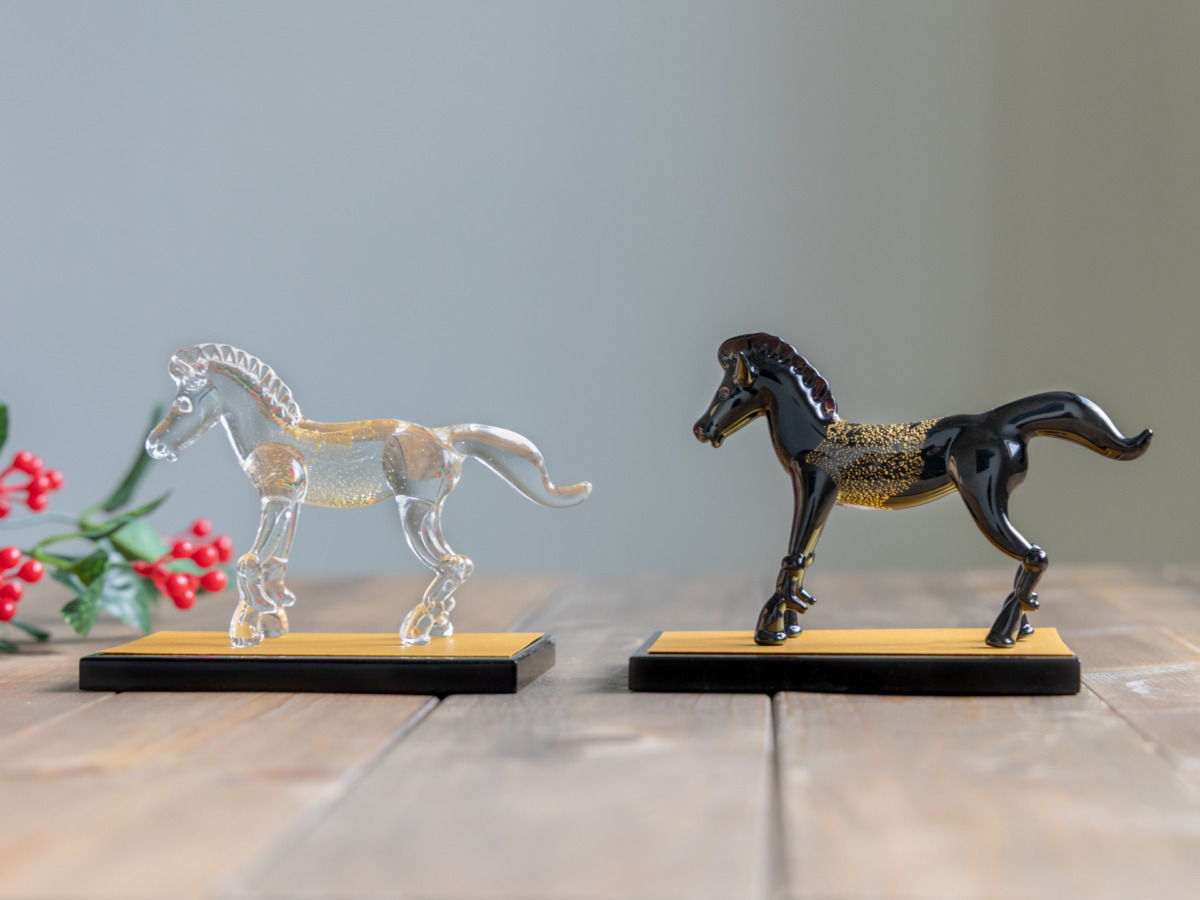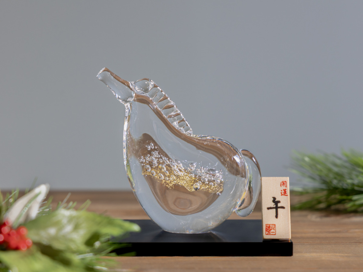干支の「午」や馬をモチーフにした硝子のオーナメントは