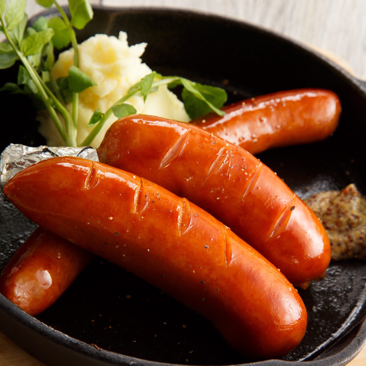 ビールと相性抜群、ソーセージやベーコンもご用意しております。ソーセージは骨付きフランク、チョリソー、粗びきポークの3本を盛り合わせにしました。ベーコンは豪快にステーキとしてお召し上がりください。