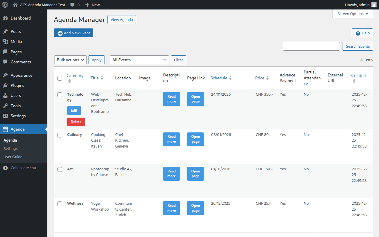 acs-agenda-managerfolder to the/wp-content/plugins/directory - Activate the plugin through the ‘Plugins’ menu in WordPress