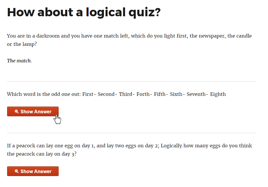 Show-Hide / Collapse-Expand allows you to easily manage the amount of content shown to user upon entering your website. It will free your pages from clutter and give your website a stylish minimalistic look and feel. You will find it handy for grouping content, composing FAQs, collapsing long lists and expanding them on click, providing hidden answers to questions, organizing your widgets more efficiently, and lots more. Inserting a shortcode is done via a handy tinyMCE button in your WordPress Editor. You will configure the look of your button/hyperlink on the fly and will be able to change it later using the provided shortcode parameters. Why don’t you give it a try?