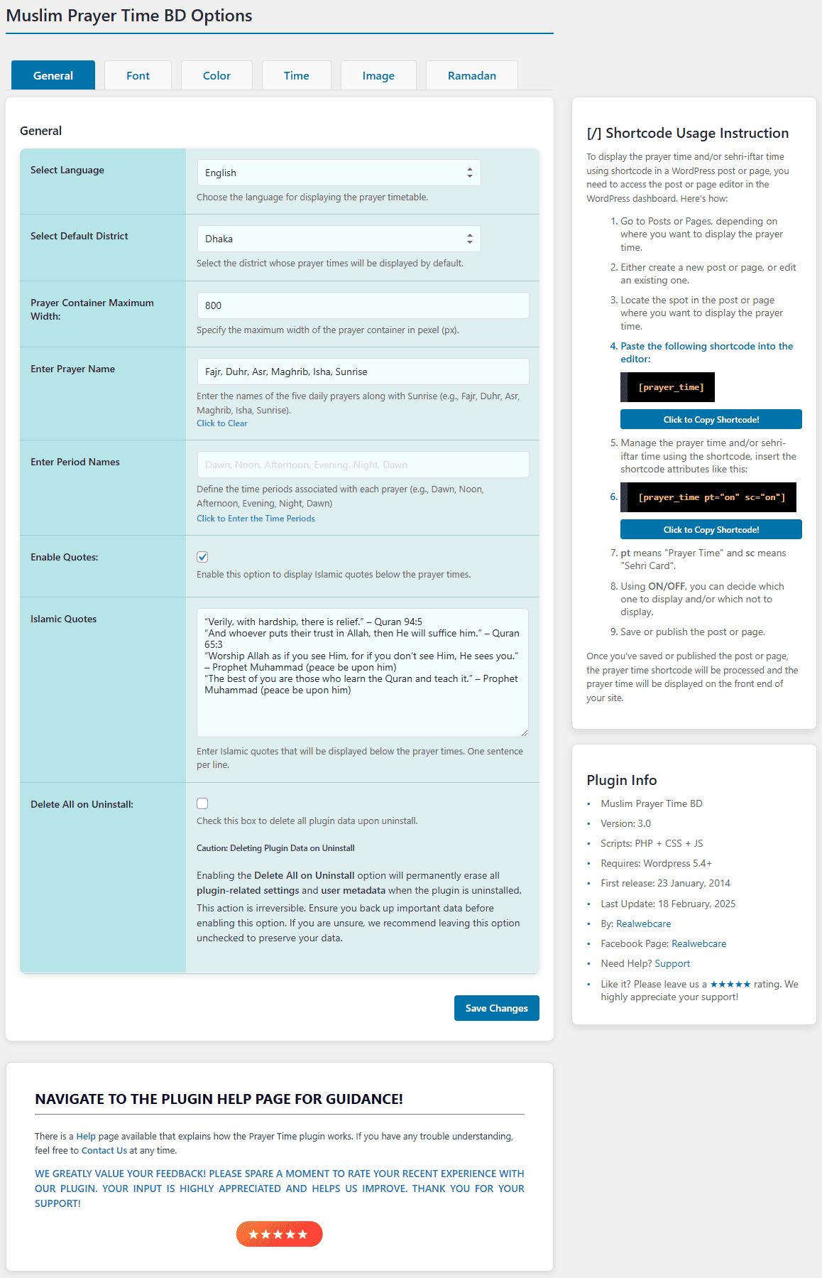 ctandqtshortcode attributes, new customization options for font size, color, and weight for prayer times and Islamic quotes, and a redesigned admin interface. Please refer to the Instructions after upgrading to version 3.0 section for details on settings changes. -