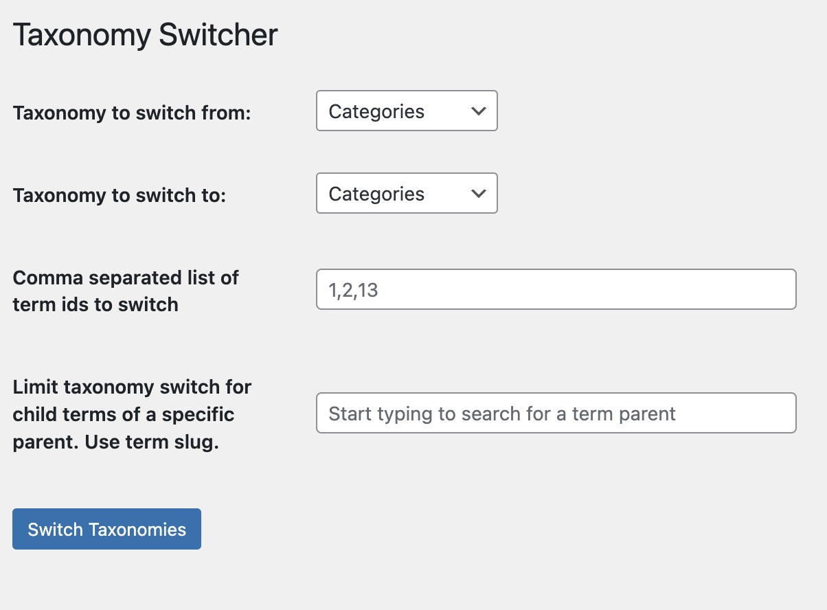 Plugin also has built-in support for WP-CLI. In the command line, type in wp taxonomy-switcher for instructions.
