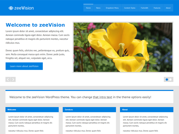 zeeVision is an elegant business WordPress theme with a colorful flat design. The modern HTML5 and CSS3 code and the responsive layout make the theme ready to be displayed on any mobile device. The built-in front page template includes an intro text, horizontal widgets area and a big content slideshow to attract visitors. You can choose from eight different color schemes, pick between left or right sidebar layout and also upload your own logo via theme options. Of course there is support of all WordPress core features like custom menus, widgetized sidebars, custom background, custom headers and featured images. Check out a full demo on http://preview.themezee.com/zeevision/