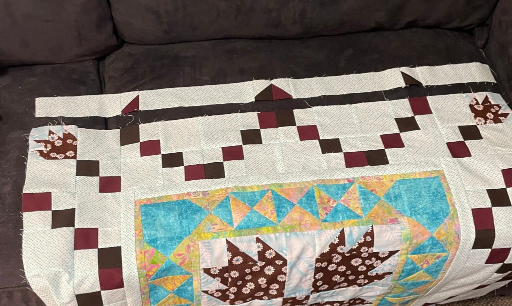 I did have to stretch the prompt a little because I wanted to continue alternating the two shades of brown, so I thought of it this: reads as two colors. From across the room, this does seem to be all the same dark brown. A mistake in measurement involved a little ripping, though. I’d remembered the block from before correctly as 6 inches. Instead of adding 3 inches to account for half of the four patch I added 1 inch for each. Lesson learned. Don’t count on math. Measure. I had enough blue (yes the background is blue) to make two sides of the border. My friend, who picked up the extra blue for me will be coming by tomorrow. And I think the border works.