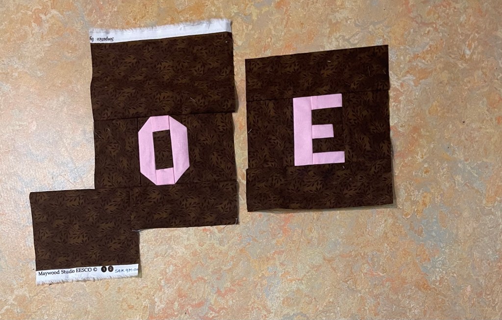 aAnd Rippin Robins letters came due. My assignment was to piece two letters and leave a lot of margin because Sharon doesn’t know how close she will be wanting her letters. She gave two sample pieced alphabets and I chose Best Day Ever from McCalls on the web. I had a little math to do to transform measurements from 11-inch letters to 3 1/2-inch letters, but it wasn’t too difficult for “O” and “E.” Sharon asked for bright pink; my pink looked a lot brighter against white and pale pint than it does against brown. She told me that the next person working on it shares the word with me, so we could coordinate. Maybe Donna will brighten it up.