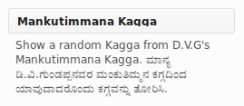 Mankutimmana Kagga, composed by Dr. D.V.Gundappa is one of the best known of the major literary works in Kannada. It is widely regarded as a masterpiece among the Kannada speaking population of southern India. This plugin creates a widget which shows a random verse from Mankutimmana Kagga. You can add this widget to any widgetized area.
