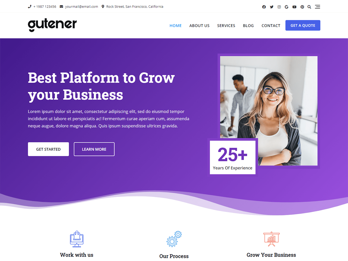 Gutener is multipurpose theme with beautifully crafted design. Gutener is beautiful, fast, lightweight, responsive, extremely customizable, multipurpose theme that you can use as a foundation to build versatile sites such as business, startups, business agencies, corporate, law firms, blog, portfolio, travel, education, fitness, university portal, church, restaurant, medical, shop, magazines, finance, accounting, consulting and preferably ideal for any type of sites. Gutener works perfectly with Gutenberg and the most popular page builder Elementor that can easily drag-and-drop your ideas from the interface. Gutener is built with SEO, speed, and usability in mind with the multiple Header & Footer layouts, predesigned starter sites includes awesome Home & Inner Pages that is incredibly customizable and powerful enough to take a stand among the crowd. Gutener is compatible with all major plugins like WooCommerce, Yoast, Contact form 7, Mailchimp for WordPress, bbPress, etc. Looking for a Multipurpose theme? Look no further! Browse the demos to see that it’s the only theme you will ever need: https://demo.keonthemes.com/gutener