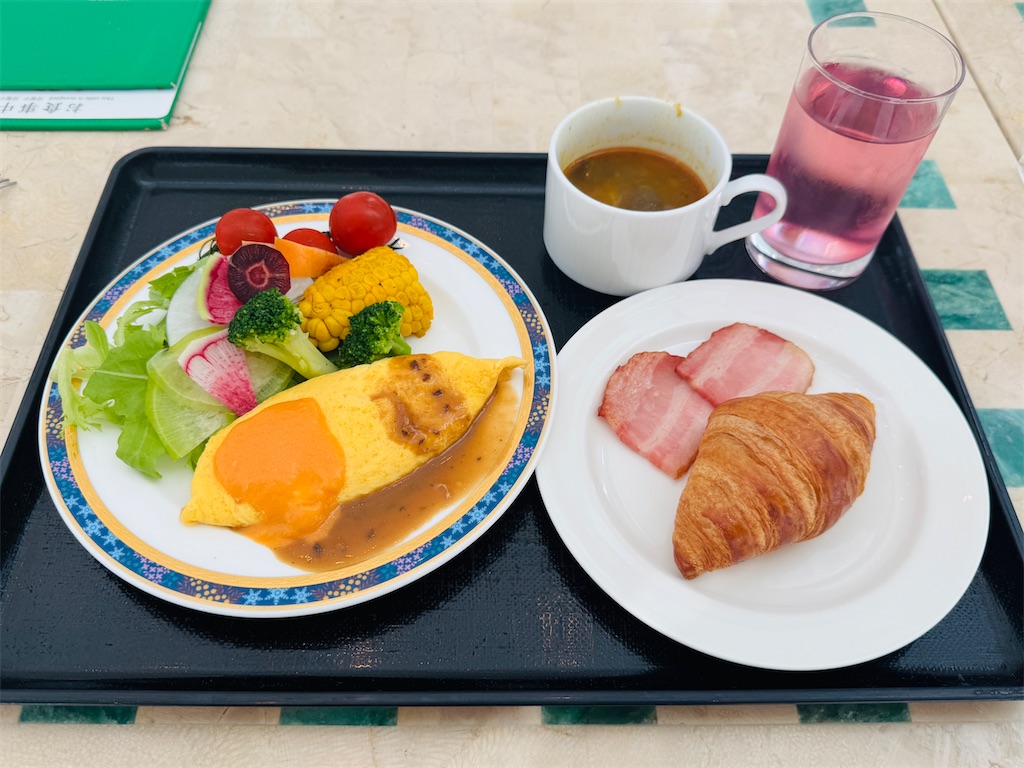 そしてお楽しみの朝食ビュッフェ!メニュー豊富でどれもおいしい。