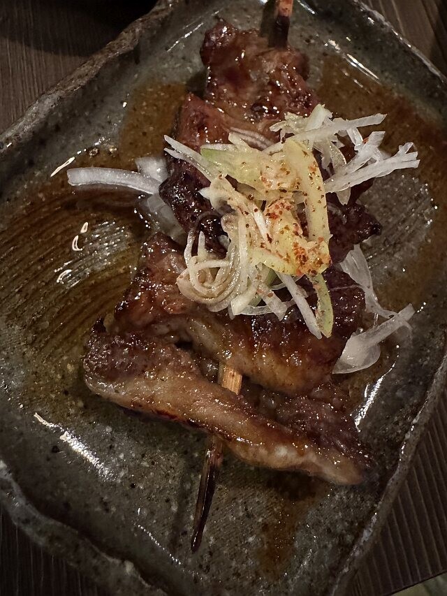 こんがりの焦げ目のついたもつ焼き、お好みで味噌をつけて食べるのが都流なのかな。