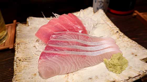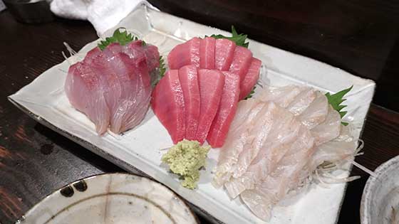二人分でいただいた刺し盛り、本マグロにヒラメ、左のはイナダかな?