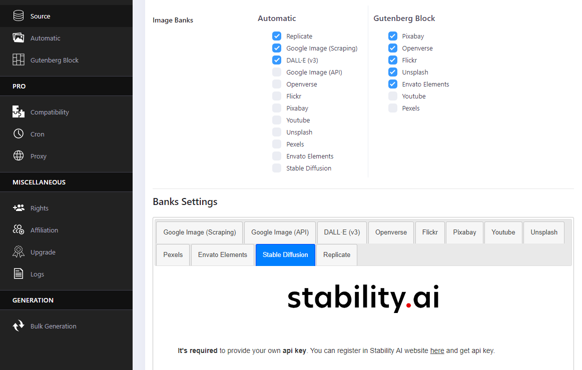 The plugin allows you to configure some settings for your automatic images : Image bank, language search, selected post types, image type, free-to-use or not, image size and much more.