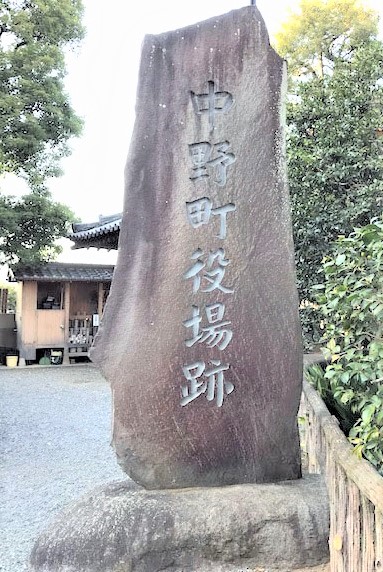 中野町役場跡碑があります。明治28年から昭和の初期まで中野町役場が、また区役所が境内に置かれたためです。