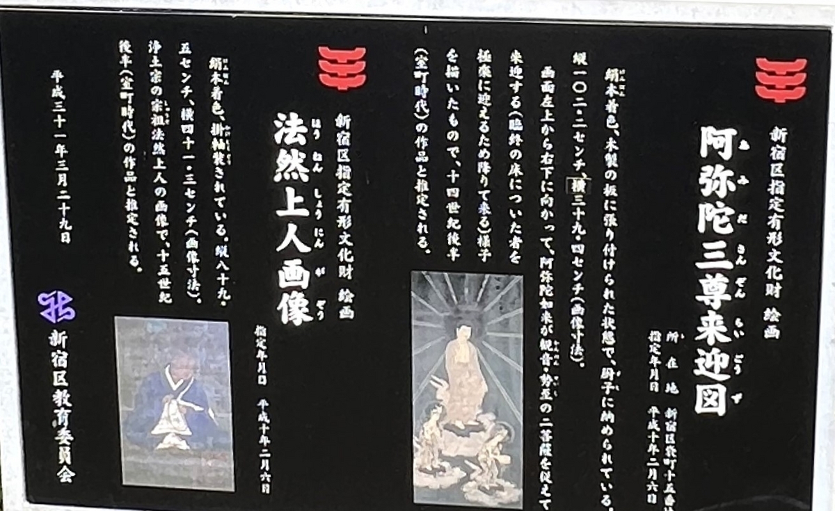 本堂左の手前に、この寺院が保有している多くの文化財を新宿区教育委員会が紹介しています。