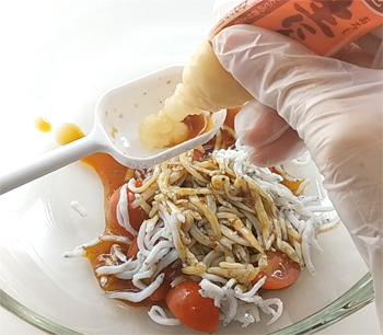 👇にんにく、オリーブオイルを入れて、良ーく混ぜときますー。