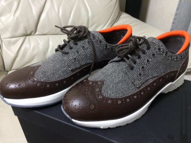 そして、見に来るだけのつもりだったけど、ヘリンボーンの靴を見つけてしまい、思わず飛びついてしまった。値段もこちらの方が高かったし、履き心地も固くて重くて足に馴染むまでに時間がかかるなあと思ったのだけど、ヘリンボーンのシャツをいくつか買ったばかりだったので、これはコーディネートできるなと即購入。踝のところのオレンジの差し色もお気に入り。