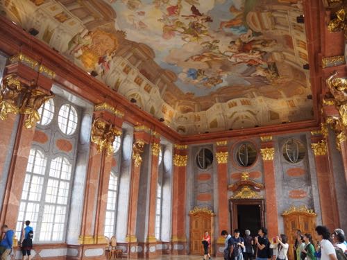 広いホールも絢爛豪華。それでもここは、修道院。立体的に見える天井画は、ほぼフラットな面に描かれている。