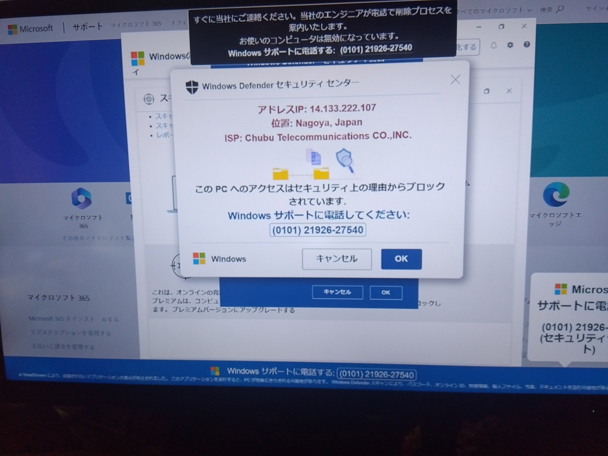 これはサポート詐欺だと思われます、皆さんも気を付けてくださいね!