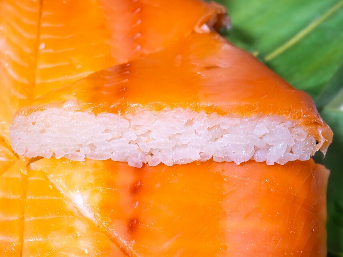 ここの鱒寿司は鱒の身が下で、酢飯が上ですね。