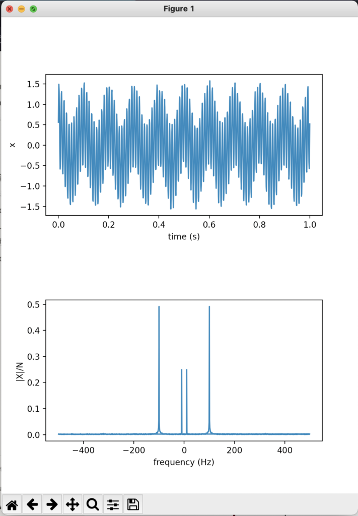 - 二段目は振幅スペクトルを表していて,入力信号に含まれる100 Hzと10 Hzにピークが見られます!