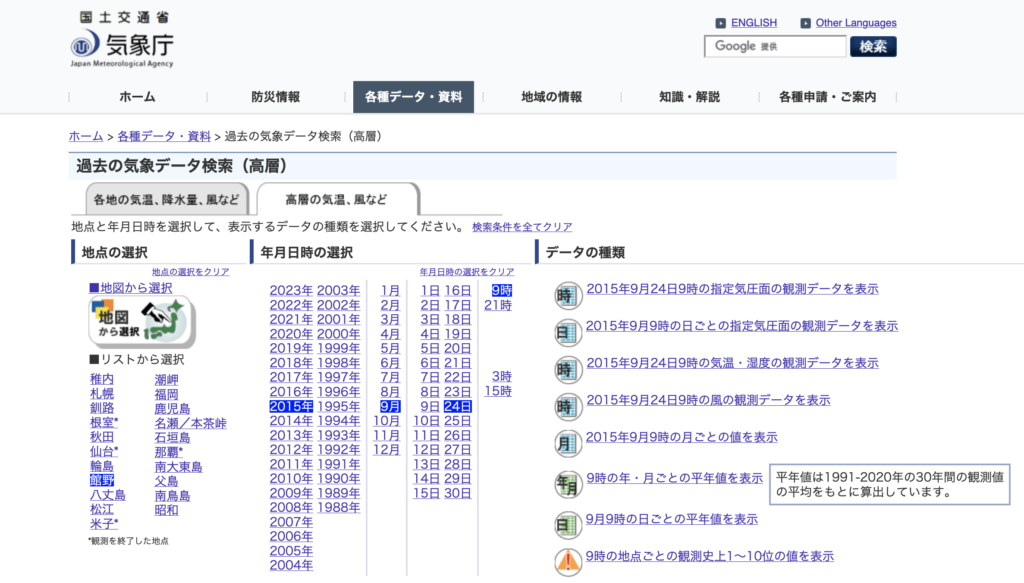 5 /// /// /// /// ///ちなみに,下のスクリーンショットに示したように,気象庁のウェブサイトから,地点,観測年,月,日,時間を指定して,データの種類(一番上の「2015年9月24日9時の指定気圧面の観測データを表示」)をクリックすると表形式でデータが表示されます。