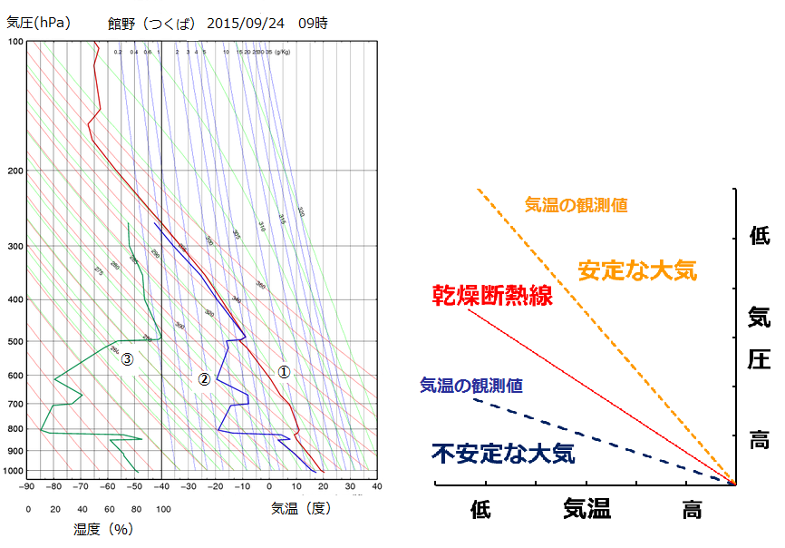 同時に湿潤断熱線,乾燥断熱線 (空気塊が飽和している時,および,していない時に持ち上げると温度がどれだけ下がっていくかを示す線です。中学校でフェーンの計算をした時に似たようなことをした記憶がある方もいらっしゃるかと思います) ,等飽和混合比線もプロットしてあるのが普通です。