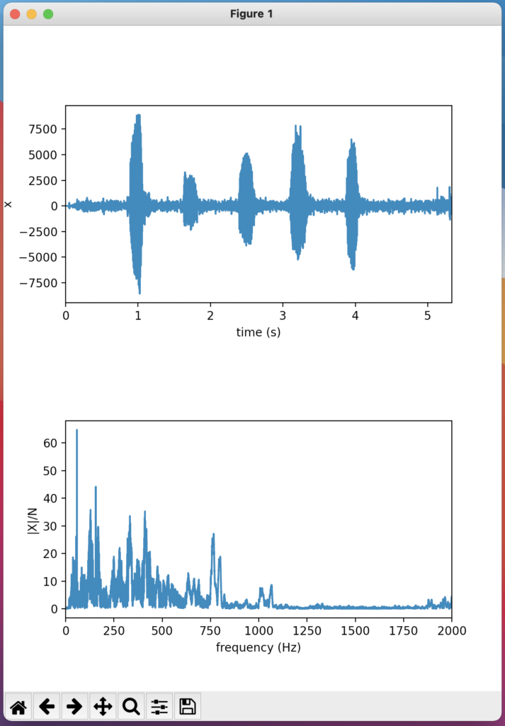 plt.show()音声データとしては何でも使用できますが,ここでは,自分の声を加工してみます。ボイスメモで録音し,適当な名前(ここでは「aiueo.m4a」)をつけて,先程コードを保存したディレクトリ(~/Desktop/LabCode/python/edit-sounds )に保存します。
