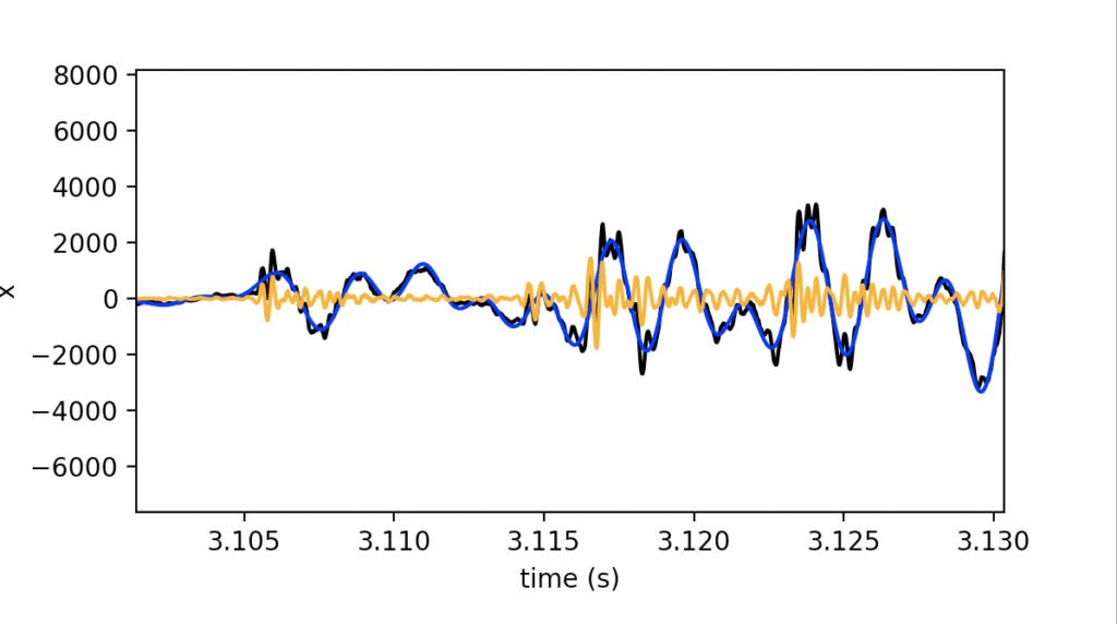 黒色の生波形に対して,青のLPFされた波形はゆっくりとした成分のみとなっており,オレンジの波形は黒色の生波形に含まれる速く振動する成分から構成されていることがわかります。