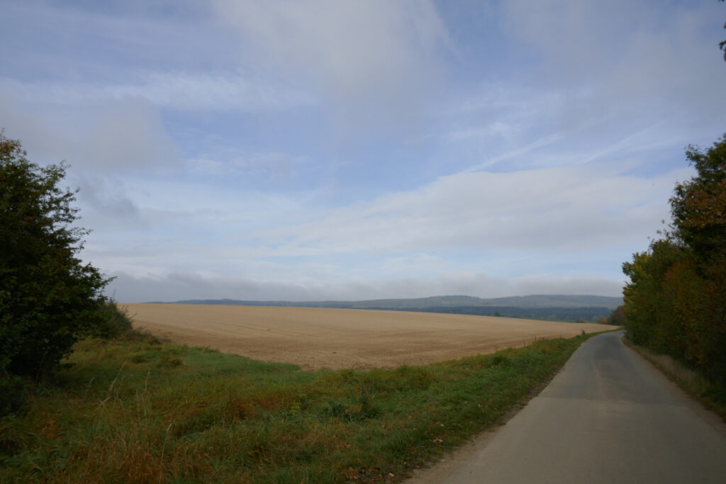 Keine Zeit für die Kirner Dolomiten – hinauf und hinaus! Etwas Wald (keine Zeit für den Teufelsfels), Vororte, ein bißchen Landstraße und dann, endlich, der Hunsrückhöhenweg. Der hält, was er verspricht – im Dunst breiten sich Felder und Herbstwald wie ein kostbarer alter Teppich bis hin zur dunklen Masse des Erbeskopfs. Es geht durch Woppenroth, vielleicht bekannter als Schabbach aus den Heimat-Filmen. Der Ort beginnt mit einer hallengroßen Kaisereiche; ein paar hundert Meter hinaus dann liegt der Galgenhügel mit dem schönsten Blick, den man sich für sein letztes Stündlein vorstellen kann.