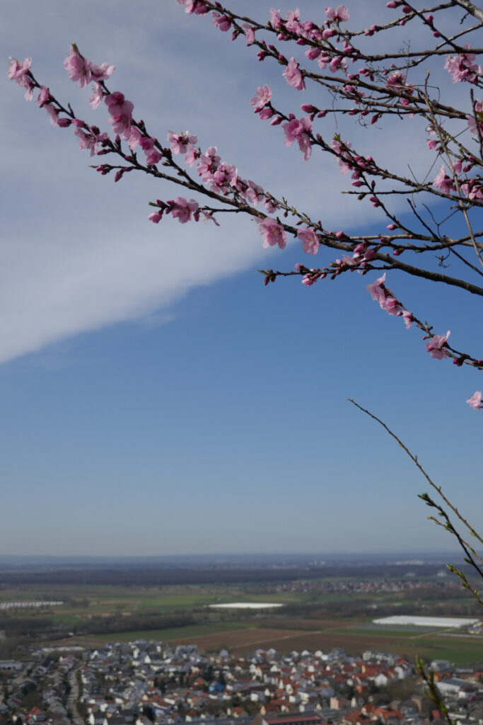 Bei Vendersheim trödeln wir ein wenig beim Aussichtsturm herum. Der ist geschlossen, aber es gibt Nußbäume, eine Quitte, in Probierreben hängen überreife, zuckersüße Trauben und direkt an den Rastbänken ein Wahlplakat der CDU. Das Land vor uns breitet sich wie die Meeresbucht, die es mal war; der Himmel liegt wie Wasser darin, und als es wärmer wird, sehen wir obendrauf Wolken keimen, wachsen, mächtig werden und auf die Reise gehen. Der Tag leuchtet hagebuttenrot in den Rosenbüschen zwischen den Weingärten. Unser Ziel können wir beinah schon sehen.