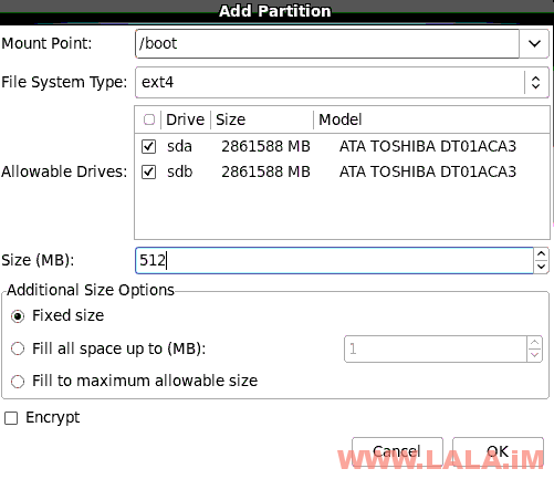 11、现在我们选中第二块硬盘的FREE区域,重复第6、10的步骤,只是这次我们只勾选第二块硬盘(sdb),如图所示: