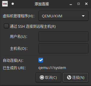 现在可以尝试来开设一台虚拟机了,在启动菜单搜索kvm,打开虚拟系统管理器,如果正常的话会提示让你输ROOT密码: