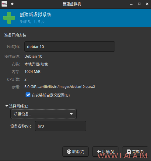 网络选择桥接br0,建议勾选“在安装前自定义配置”: