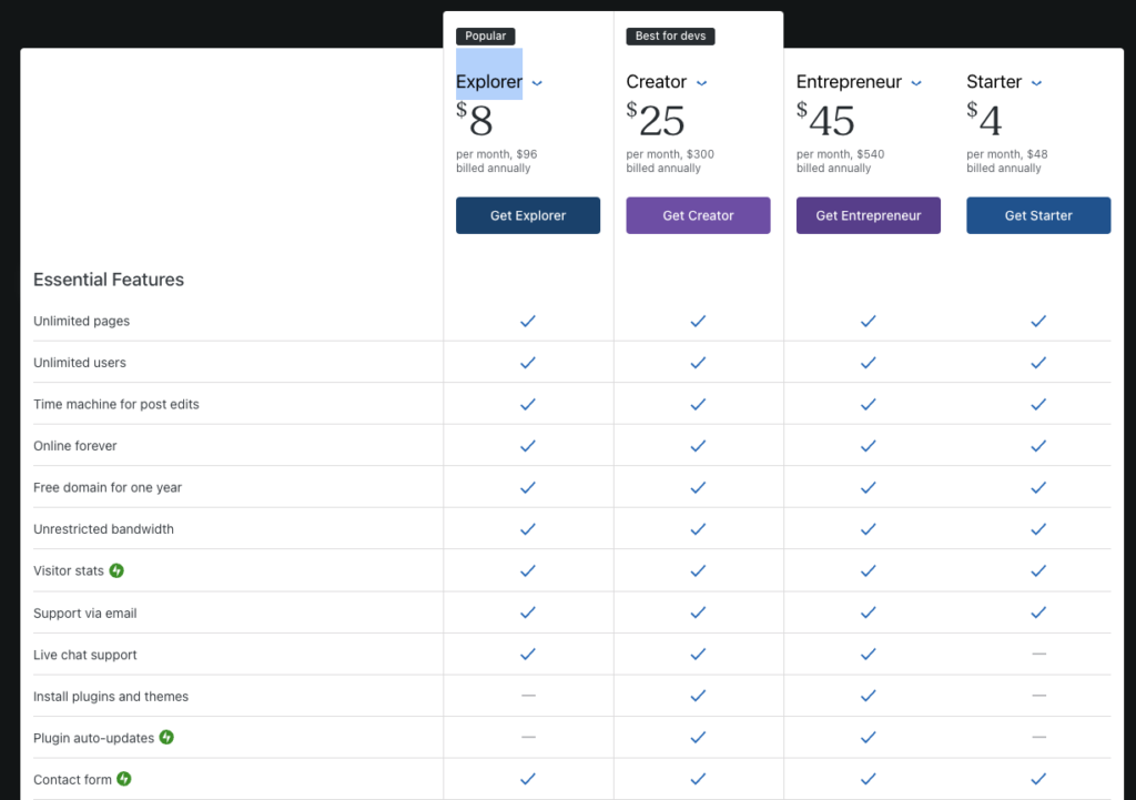 If you are trying to start just a basic informational website or blog and don’t want to deal with hosting, then WordPress.com’s Blogger and Personal plans are well-priced.