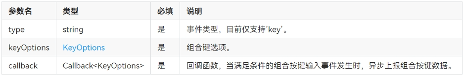 inputConsumer.on(type: ‘key’, keyOptions: KeyOptions, callback: Callback<KeyOptions>)